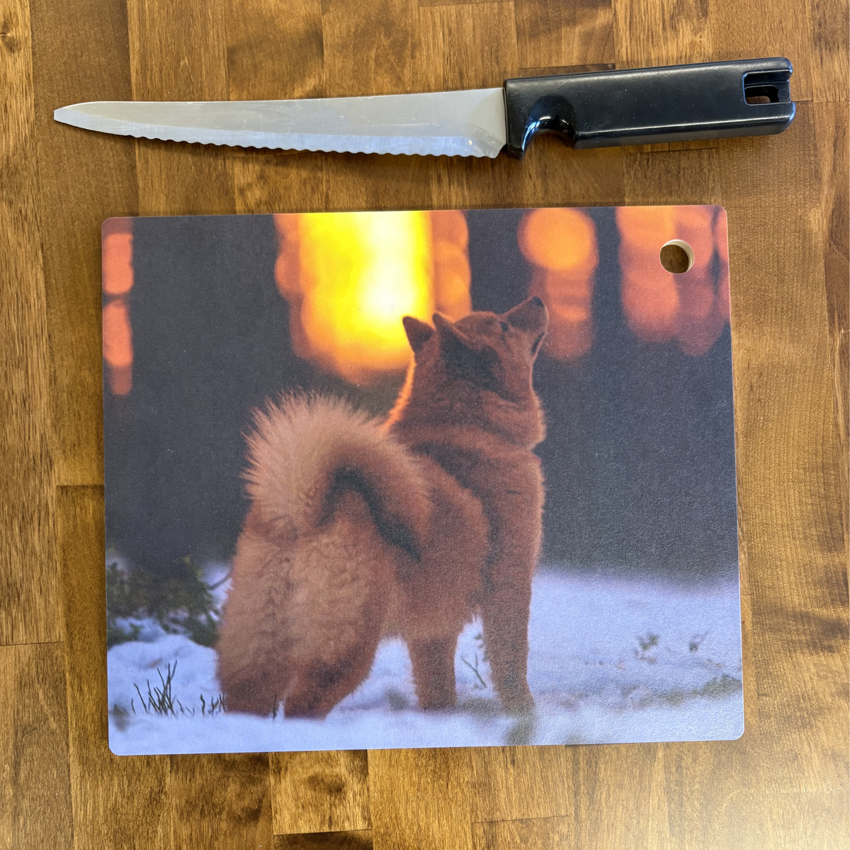 Kestävän leikkuualustan pintaa koristaa kaunis kuva Suomen kansalliskoirasta, suomen pystykorvasta.